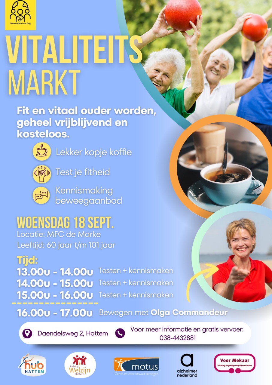 Fit en vitaal ouder worden, ontdek hoe - op de Vitaliteitsmarkt 2024 Datum: woensdag 18 september, van 13.00 tot 17.00 uur Locatie: MFC De Marke Bel voor meer informatie en gratis vervoer 038 - 443 28 81 [...]