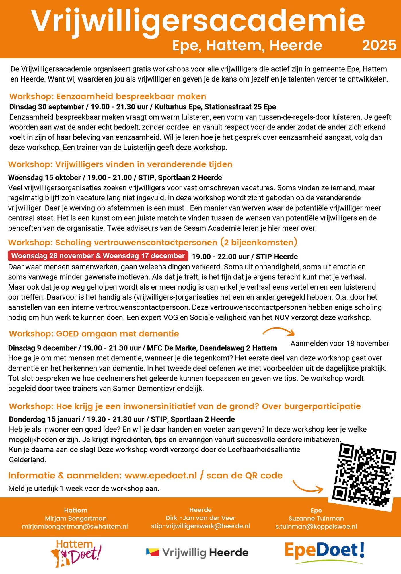 De workshops worden aangeboden door de Vrijwilligersacademie Noord-Oost Veluwe, een samenwerking tussen Stichting Welzijn Hattem en de vrijwilligersplatforms uit Heerde en Epe. Dat maakt dat alle vrijwilligers uit Hattem en de andere twee gemeentes gratis mogen deelnemen aan het workshopaanbod! En vrijwilliger ben je als je meerdere dagen per week vrijwilligerswerk doet, maar natuurlijk ook als je zo nu en dan als vrijwilliger actief bent. Voel je welkom!